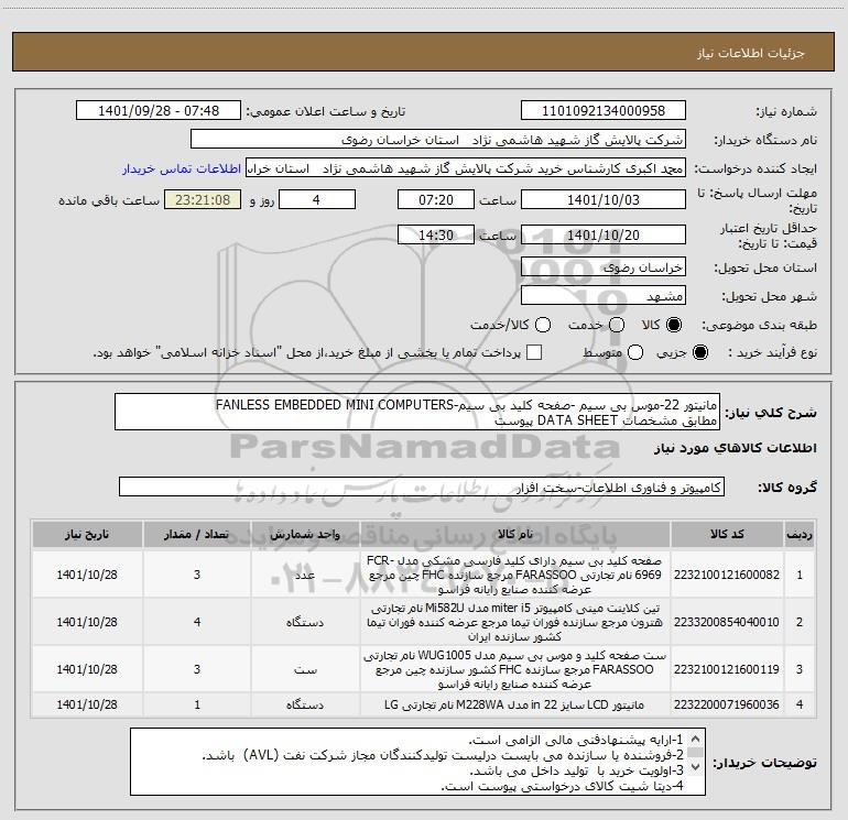 نام دستگاه خریدار:شرکت پالایش گاز شهید هاشمی نژاد استان خراسان رضوی