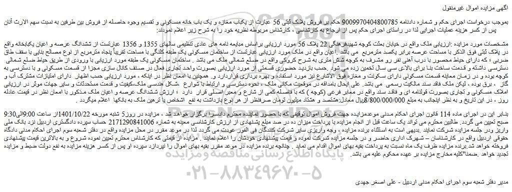 بموجب درخواست اجرای حکم و شماره دادنامه 9009970404800785 حکم بر فروش پلاک ثبتی 56 عبارت از یکباب مغازه و یک باب خانه مسکونی و تقسیم وجوه حاصله از فروش بین طرفین به نسبت سهم الارث آنان پس از کسر هزینه عملیات اجرایی لذا در راستای اجرای حکم پس از ارجاع به کارشناسی ، کارشناس مربوطه نظریه خود را به شرح زیر اعلام نمودند: