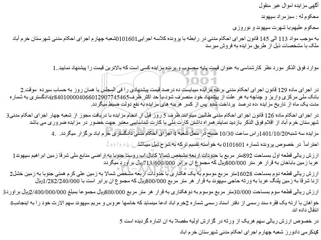 به موجب مواد 113 الی 145 قانون اجرای احکام مدنی در رابطه با پرونده کلاسه اجرایی0101601شعبه چهارم اجرای احکام مدنی شهرستان خرم آباد ملک با مشخصات ذیل از طریق مزایده به فروش میرسد