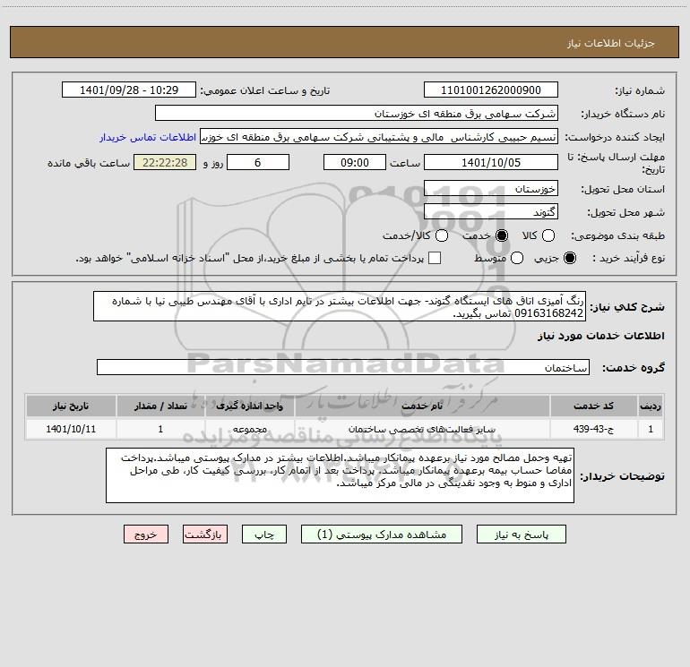 شرح کلی نیاز: رنگ آمیزی اتاق های ایستگاه گتوند- جهت اطلاعات بیشتر در تایم اداری با آقای مهندس طیبی نیا با شماره 09163168242 تماس بگیرید.