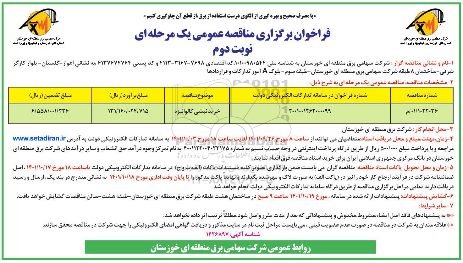 1. نام و نشانی مناقصه گزار: شرکت سهامی برق منطقه ای خوزستان به شناسه ملی 10100980544 کد اقتصادی 7698-3167-4113 و کدپستی 6137674764 به نشانی اهواز، گلستان بلوار کارگر شرقی، ساختمان 8 طبقه شرکت سهامی برق منطقه ای خوزستان، طبقه سوم، بلوک A امور تدارکات و قراردادها