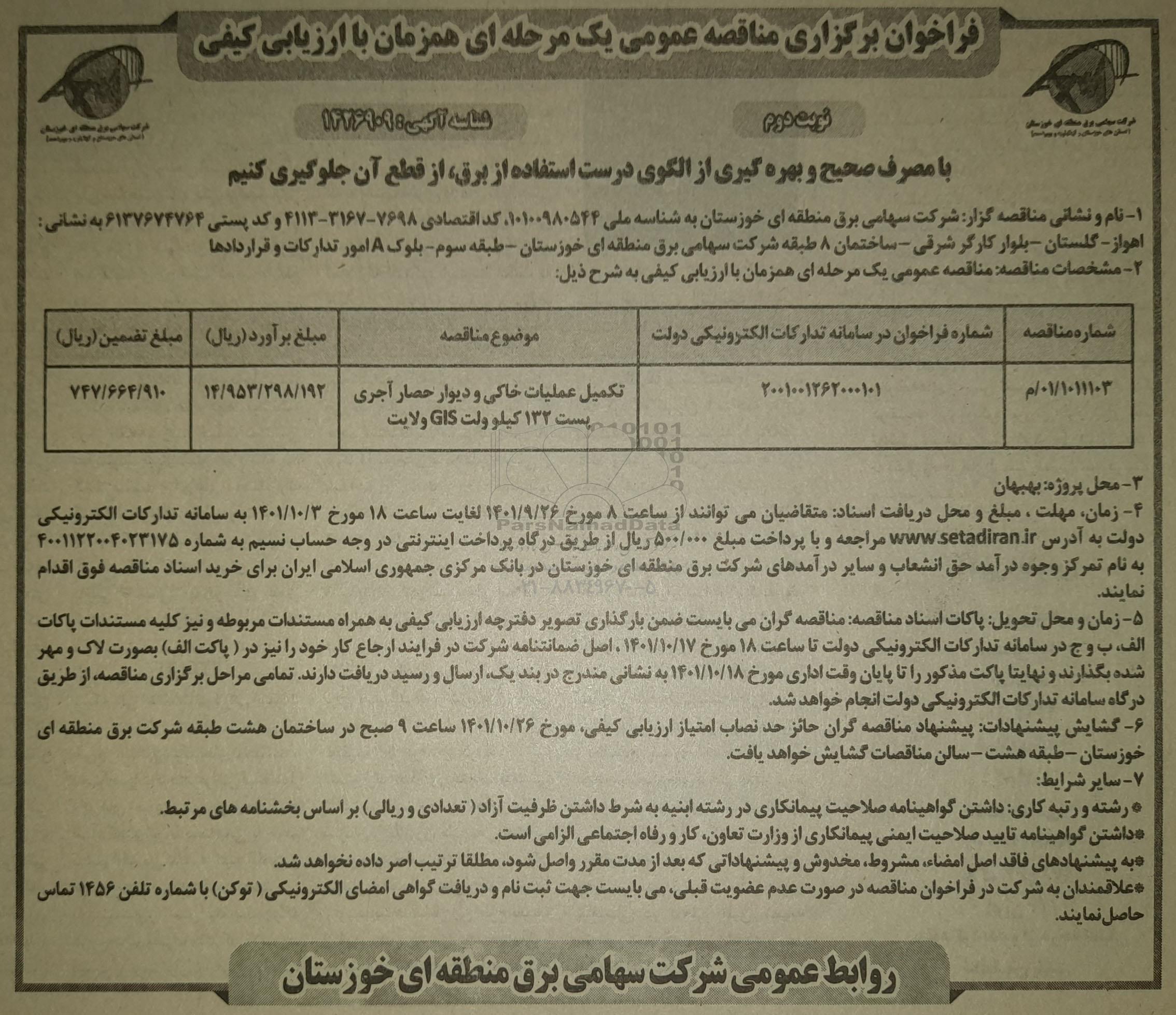 1011103/01/م 2001001262000101 تکمیل عملیات خاکی و دیوار حصار آجری پست 132 کیلوولت gis ولایت  14.953.298.192 747.664.910