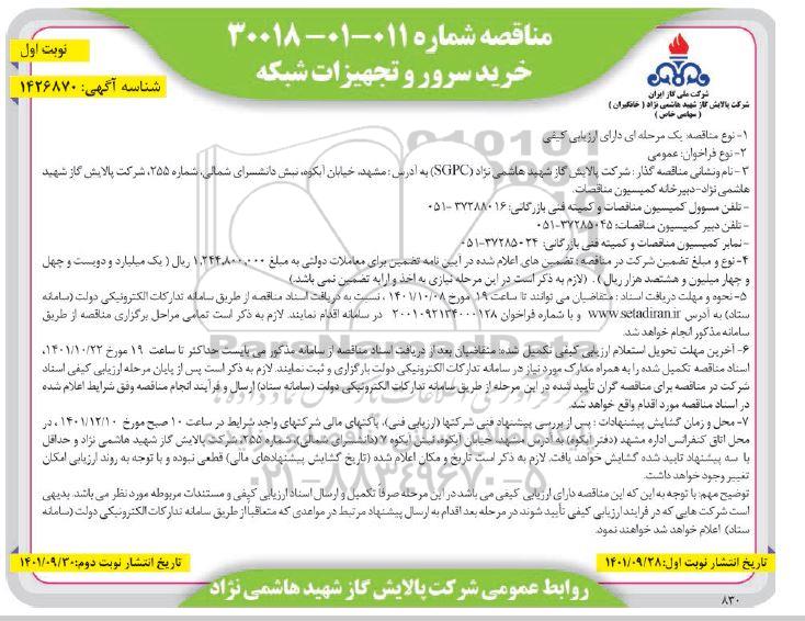 7- محل و زمان گشایش پیشنهادات: پس از بررسی پیشنهاد فنی شرکت ارزیابی فنی پاکتهای مالی شرکت های واجد شرایط در ساعت 10 صبح مورخ 1401.12.10  در محل اتاق کنفرانس اداره مشهد (دفتر آبکوه) به آدرس : مشهد خیابان آبکوه نبش دانشسرای شمالی شماره 255 شرکت پالایش گاز شهید هاشمی نژاد و حداقل با سه پیشنهاد تایید شده گشایش خواهد یافت. لازم به ذکر است تاریخ و مکان اعلام شده ( تاریخ گشایش پیشنهادهای مالی) قطعی نبوده و با توجه به روند ارزیابی امکان تغییر وجود خواهد داشت.