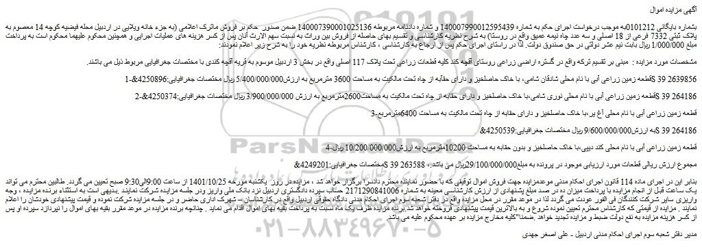 مشخصات مورد مزایده : مبنی بر تقسیم ترکه واقع در گستره اراضی زراعی روستای آقچه کند کلیه قطعات زراعی تحت پلاک 117 اصلی واقع در بخش 3 اردبیل موسوم به قریه آقچه کندی با مختصات جغرافیایی مربوط ذیل می باشند.