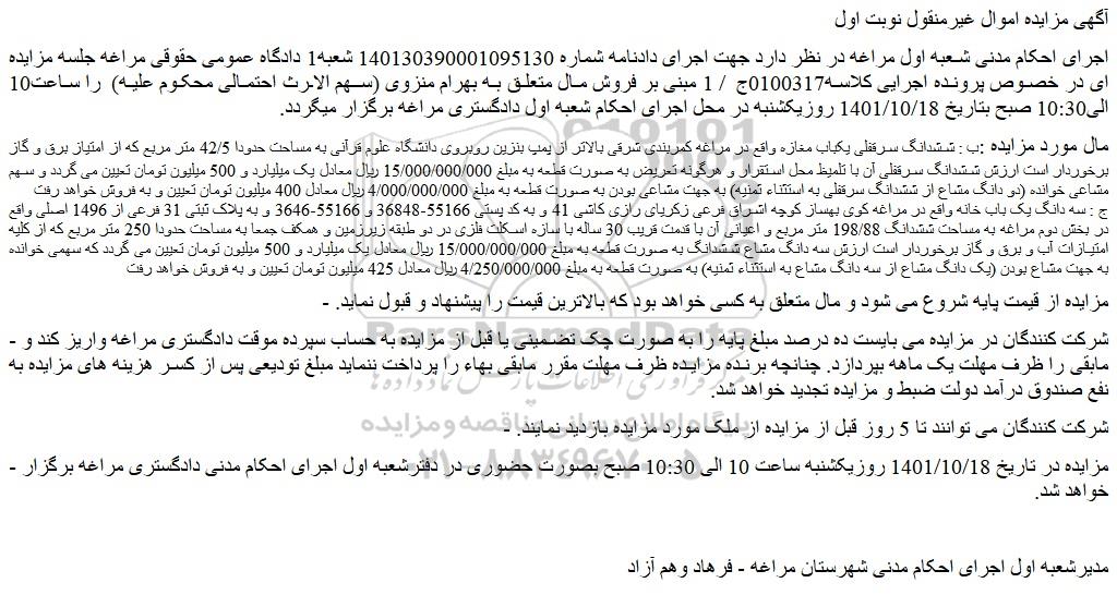 - مزایده در تاریخ 1401/10/18 روزیکشنبه ساعت 10 الی 10:30 صبح بصورت حضوری در دفترشعبه اول اجرای احکام مدنی دادگستری مراغه برگزار خواهد شد.