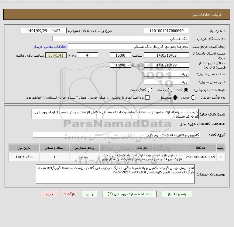 شرح کلی نیاز: خرید، نصب، راه اندازی و آموزش سامانه اتوماسیون اداری مطابق با فایل الزامات و پیش نویس قرارداد پیوستی. ایران کد مشابه.