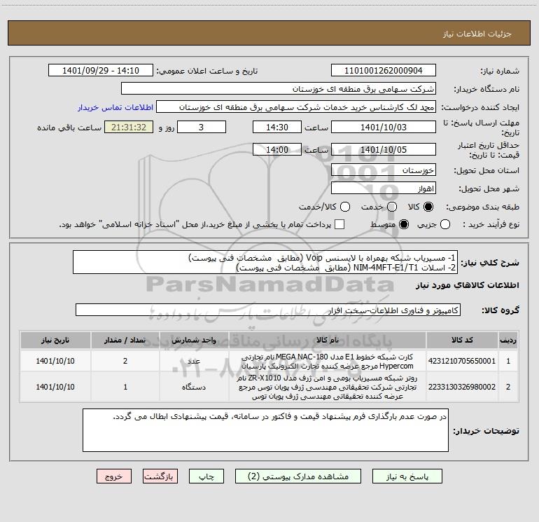 شرح کلی نیاز: 1- مسیریاب شبکه بهمراه با لایسنس Voip (مطابق مشخصات فنی پیوست)