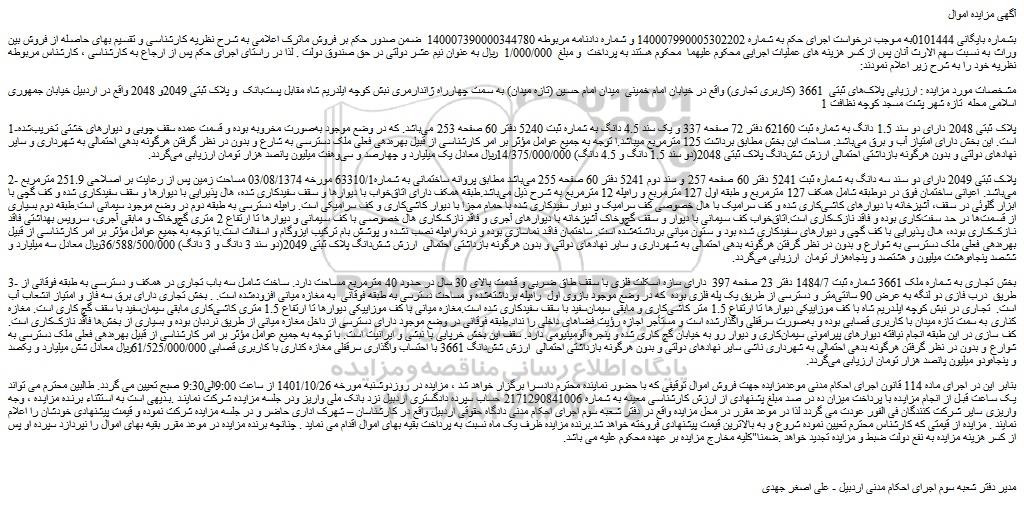 مشخصات مورد مزایده : ارزیابی پلاک های ثبتی 3661 (کاربری تجاری) واقع در خیابان امام خمینی میدان امام حسین (تازه میدان) به سمت چهارراه ژاندارمری نبش کوچه ایلدریم شاه مقابل پست بانک و پلاک ثبتی 2049و 2048 واقع در اردبیل خیابان جمهوری اسلامی محله تازه شهر پشت مسجد کوچه نظافت 1