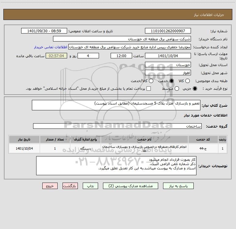 شرح کلی نیاز: تعمیر و بازسازی منزل پلاک 5 مسجدسلیمان (مطابق اسناد پیوست)