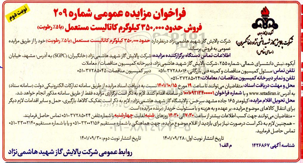 شرکت پالایش گاز شهید هاشمی نژاد در نظر داردحدود 350.000 کیلوگرم کاتالیست مستعمل (با 5% رطوبت) خود را از طریق مزایده عمومی به فروش برساند