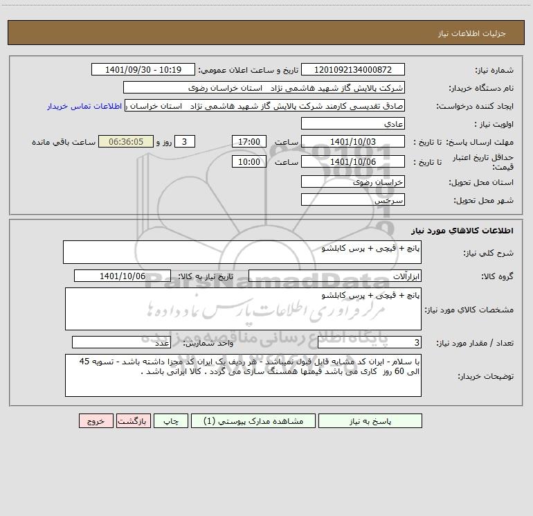نام دستگاه خریدار:شرکت پالایش گاز شهید هاشمی نژاد استان خراسان رضوی