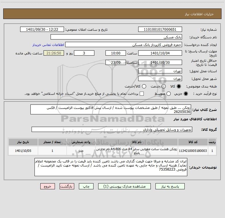 شرح کلی نیاز: زونکن ... طبق نمونه / طبق مشخصات پیوست شده / ارسال پیش فاکتور پیوست الزامیست / فکس 26205036