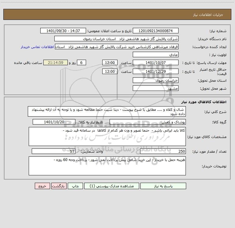نام دستگاه خریدار:شرکت پالایش گاز شهید هاشمی نژاد استان خراسان رضوی