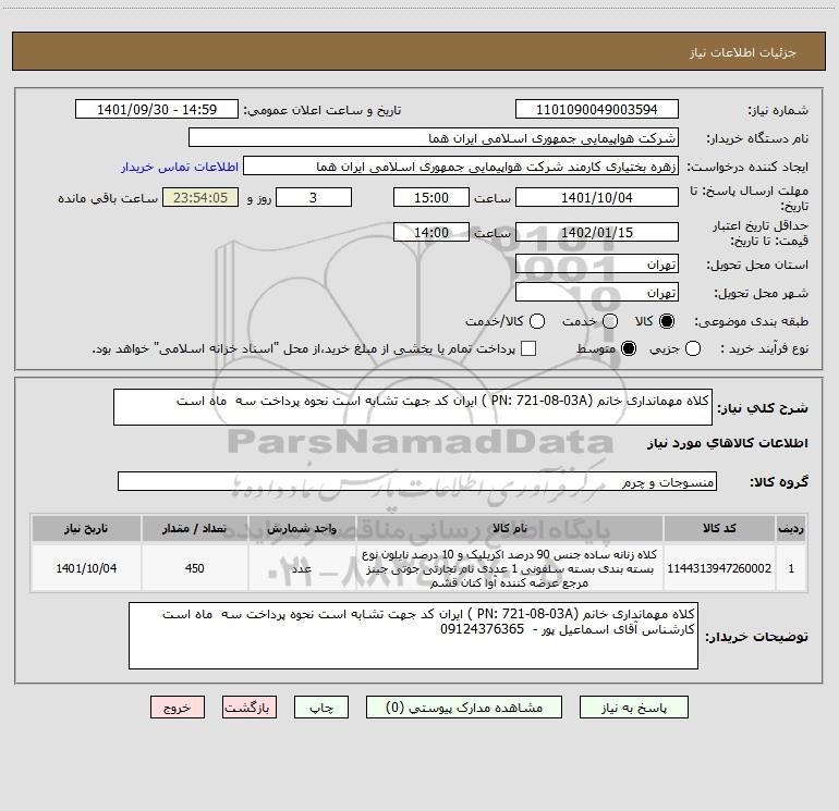 شرح کلی نیاز: کلاه مهمانداری خانم (PN: 721-08-03A ) ایران کد جهت تشابه است نحوه پرداخت سه ماه است