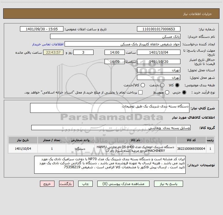 توضیحات خریدار:ایران کد مشابه است و دستگاه بسته بندی شرینک پک مدل NP70 با دوخت سرامیک نادی پک مورد تایید می باشد . هزینه ارسال به عهده فروشنده می باشد . دستگاه با گارانتی شرکت نادی پک مورد تایید است . ارسال پیش فاکتور با مشخصات کالا الزامی است . شفیعی 75358219