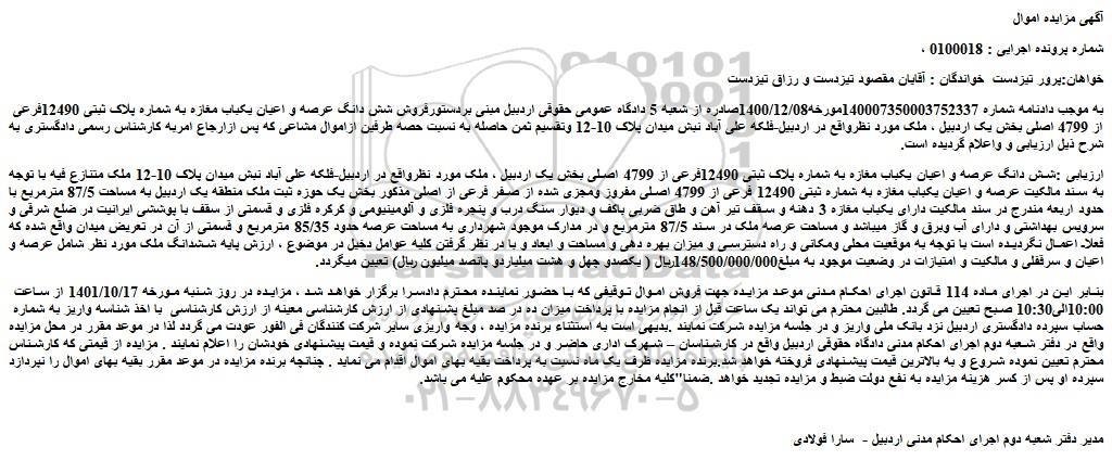 به موجب دادنامه شماره 140007350003752337مورخه1400/12/08صادره از شعبه 5 دادگاه عمومی حقوقی اردبیل مبنی بردستورفروش شش دانگ عرصه و اعیان یکباب مغازه به شماره پلاک ثبتی 12490فرعی از 4799 اصلی بخش یک اردبیل ، ملک مورد نظرواقع در اردبیل-فلکه علی آباد نبش میدان پلاک 10-12 وتقسیم ثمن حاصله به نسبت حصه طرفین ازاموال مشاعی که پس ازارجاع امربه کارشناس رسمی دادگستری به شرح ذیل ارزیابی و واعلام گردیده است.