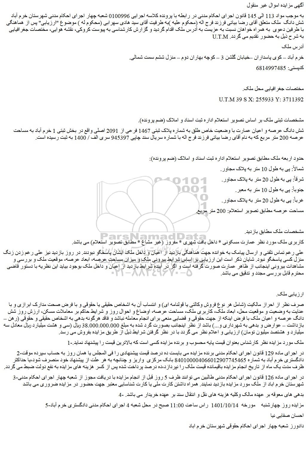 5-مزایده روز چهارشنبه مورخه 1401/10/14 راس ساعت 11:00 صبح در محل شعبه 4 اجرای احکام مدنی دادگستری خرم آباد
