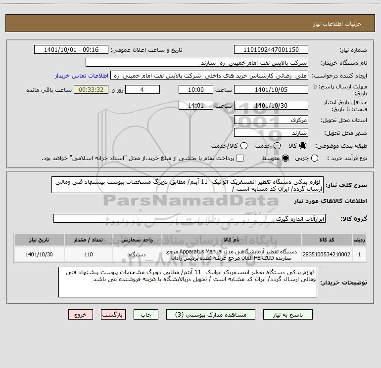 توضیحات خریدار: لوازم یدکی دستگاه تقطیر اتمسفریک اتواتیک 11 آیتم/ مطابق دوبرگ مشخصات پیوست پیشنهاد فنی ومالی ارسال گردد/ ایران کد مشابه است / تحویل درپالایشگاه با هزینه فروشنده می باشد