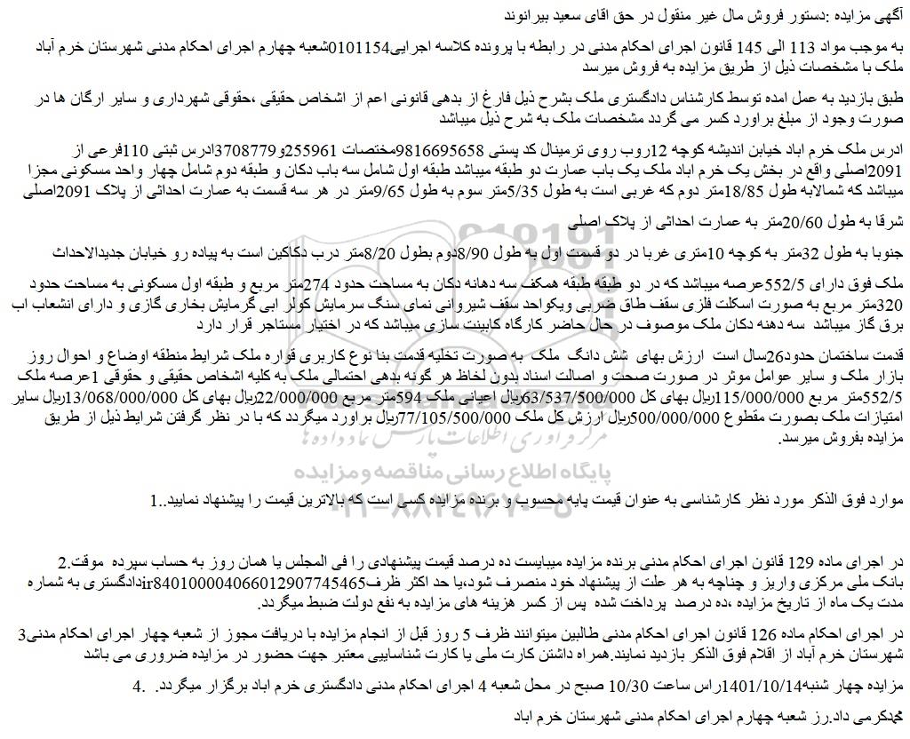 به موجب مواد 113 الی 145 قانون اجرای احکام مدنی در رابطه با پرونده کلاسه اجرایی0101154شعبه چهارم اجرای احکام مدنی شهرستان خرم آباد ملک با مشخصات ذیل از طریق مزایده به فروش میرسد