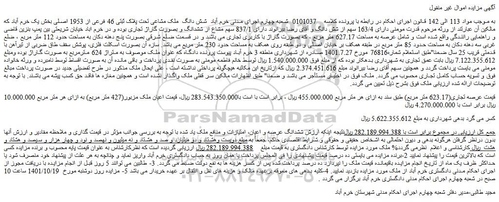 جمع کل ارزیابی در مجموع برابر است با 282.189.994.388 ریالنتیجه اینکه ارزش ششدانگ عرصه و اعیان، امتیازات و منافع ملک یاد شده با توجه به بررسی جوانب مؤثر در قیمت گذاری و ملاحظه مقادیر و ارزش آنها بدون درنظر گرفتن هرگونه بدهی و دیون احتمالی به اشخاص حقیقی و حقوقی و شرایط اقتصادی حاکم، جمعاً به مبلغ دویست وهشتاد و دو میلیارد و صد و هشتاد و نه میلیون و نهصد و نود و چهار هزار و سیصد و هشتاد و هشت  ریال کارشناسی و اعلام  نظرمی گردد% ملک مورد مزایده توسط کارشناس دادگستری به قیمت مبلغ    282.189.994.388 ریال ارزیابی گردیده است که نظرکارشناس به عنوان قیمت پایه محسوب و برنده مزایده کسی است که بالاترین قیمت را پیشنهاد نمایید 2-برنده مزایده می بایستی ده درصد قیمت پیشنهادی را فی المجلس پرداخت یا همان روز به حساب دادگستری خرم آباد واریز نماید و چنانچه به هر علت از پیشنهاد خود منصرف شود یا حداکثر ظرف یک ماه از تاریخ انجام مزایده باقیمانده قیمت ملک را نپردازد ده درصد پرداخت شده پس از کسر هزینه ها به نفع دولت ضبط می گردد. 3- طالبین می توانند 5 روز قبل از انجام مزایده با دریافت مجوز از اجرای احکام مدنی دادگستری خرم آباد از ملک مورد مزایده بازدید نمایید. 4-کلیه بدهی های معوقه برعهده مالک و هزینه های نقل و انتقال بر عهده خریدار می باشد 5- مزایده روز دوشنبه مورخ  1401/10/19 ساعت 10 صبح در شعبه چهارم اجرای احکام مدنی دادگستری خرم آباد برگزار می گردد .