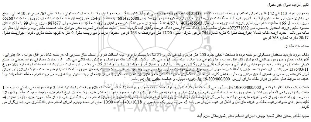 به موجب مواد 113 الی 142 قانون اجرای احکام در رابطه با پرونده کلاسه 0101437 شعبه چهارم اجرای مدنی خرم آباد شش دانگ عرصه و اعیان یک باب عمارت مسکونی با پلاک ثبتی 767 فرعی از 10 اصلی ، واقع در بخش2 حوزه ثبتی ملک خرم آباد به آدرس خرم آباد – گلدشت غربی– اتهای خیابان ارم – کوچه اتابکان 12–کد پستی6814836388 با مساحت 154،8 متر 1)مطابق سند مالکیت با شماره ی ورق مالکیت 661687 سری ب ، سال 99 با مالکیت خانم مریم لطیفی فرزند اسفندیاربه شماره ملی 4072455563 با 4/57 دانگ مشاع از شش دانگ عرصه و اعیان و 2)سند مالکیت به شماره چاپی 987677 سری ج سال 99 با مالکیت آقای مسعود لطیفی فرزند اسفندیار به شماره ملی 4072771082 بعنوان مالک 1/43 دانگ مشاع ازشش دانگ عرصه واعیان ثبت گردیده است . طبقه همکف در تصرف مادر خواهان خانم عصمت ملکی بوده و طبقه اول خالی از سکنه می باشد . حدود اربعه ملک: شمالا :دیواریست بطول9 متربه شماره 764 فرعی ،شرقا : بطول 17/20 متر دیواریست به 766 فرعی ،جنوبا : درب و دیواریست بطول 9 متر به کوچه هشت متری ،غربا : دیواریست بطول 20/17 متر به شماره 768 فرعی