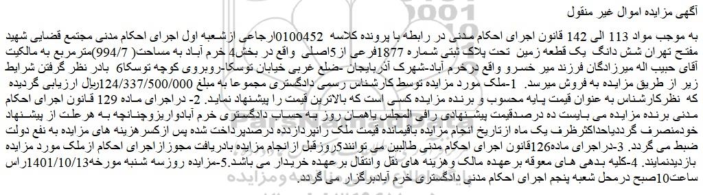 به موجب مواد 113 الی 142 قانون اجرای احکام مدنی در رابطه با پرونده کلاسه  0100452ارجاعی ازشعبه اول اجرای احکام مدنی مجتمع قضایی شهید مفتح تهران شش دانگ  یک قطعه زمین  تحت پلاک ثبتی شماره 1877فرعی از5اصلی  واقع در بخش4 خرم آباد به مساحت( 994/7)مترمربع به مالکیت آقای حبیب اله میرزادگان فرزند میر خسرو واقع درخرم آباد-شهرک آذربایجان -ضلع غربی خیابان توسکا-روبروی کوچه توسکا6  بادر نظر گرفتن شرایط زیر از طریق مزایده به فروش میرسد.  1-ملک مورد مزایده توسط کارشناس رسمی دادگستری مجموعا به مبلغ 124/337/500/000ریال ارزیابی گردیده  که  نظرکارشناس به عنوان قیمت پایه محسوب و برنده مزایده کسی است که بالاترین قیمت را پیشنهاد نماید. 2- دراجرای ماده 129 قانون اجرای احکام مدنی برنده مزایده می بایست ده درصدقیمت پیشنهادی رافی المجلس یاهمان روز به حساب دادگستری خرم آبادواریزوچنانچه به هرعلت از پیشنهاد خودمنصرف گرددیاحداکثرظرف یک ماه ازتاریخ انجام مزایده باقیمانده قیمت ملک رانپردازدده درصدپرداخت شده پس ازکسرهزینه های مزایده به نفع دولت ضبط می گردد. 3-دراجرای ماده126قانون اجرای احکام مدنی طالبین می توانند5روزقبل ازانجام مزایده بادریافت مجوزازاجرای احکام ازملک مورد مزایده بازدیدنمایند. 4-کلیه بدهی های معوقه برعهده مالک وهزینه های نقل وانتقال برعهده خریدار می باشد.5-مزایده روزسه شنبه مورخه1401/10/13راس ساعت10صبح درمحل شعبه پنجم اجرای احکام مدنی دادگستری خرم آبادبرگزار می گردد.