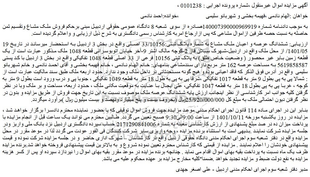 به موجب دادنامه شماره 140007390000969919صادره از سوی  شعبه 8 دادگاه عمومی حقوقی اردبیل مبنی برحکم فروش ملک مشاع وتقسیم ثمن حاصله به نسبت حصه طرفین ازاموال مشاعی که پس ازارجاع امربه کارشناس رسمی دادگستری به شرح ذیل ارزیابی و واعلام گردیده است.