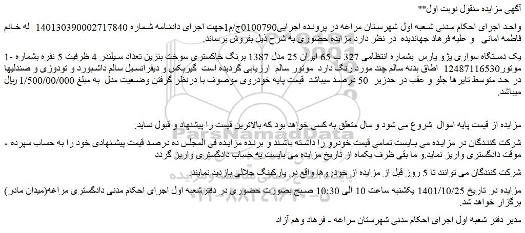 مزایده در تاریخ 1401/10/25 یکشنبه ساعت 10 الی 10:30 صبح بصورت حضوری در دفترشعبه اول اجرای احکام مدنی دادگستری مراغه(میدان مادر) برگزار خواهد شد.