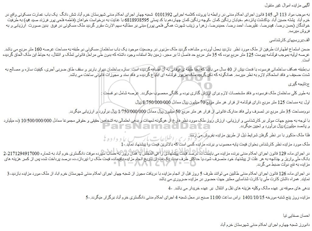 به موجب مواد 113 الی 145 قانون اجرای احکام مدنی در رابطه با پرونده کلاسه اجرایی 0101392 شعبه چهار اجرای احکام مدنی شهرستان خرم آباد شش دانگ یک باب عمارت مسکونی واقع در خرم آباد پشته حسین آباد ،پاکدشت پانزدهم ،خیابان رنگین کمان ،کوچه رنگین کمان چهاردهم با کد پستی 6818938595 با عنایت به درخواست خواهان (فاطمه فتحی پور فرزند صید محمد) به طرفیت خواندگان (حسن رضا، محمدرضا، علیرضا، احمد رضا، حمیدرضا، زهرا و زینب شهرت همگی فتحی پور) مبنی بر مطالبه سهم الارث مقرر گردید ملک مسکونی در فوق بدین صورت ارزیابی و به فروش میرسد.