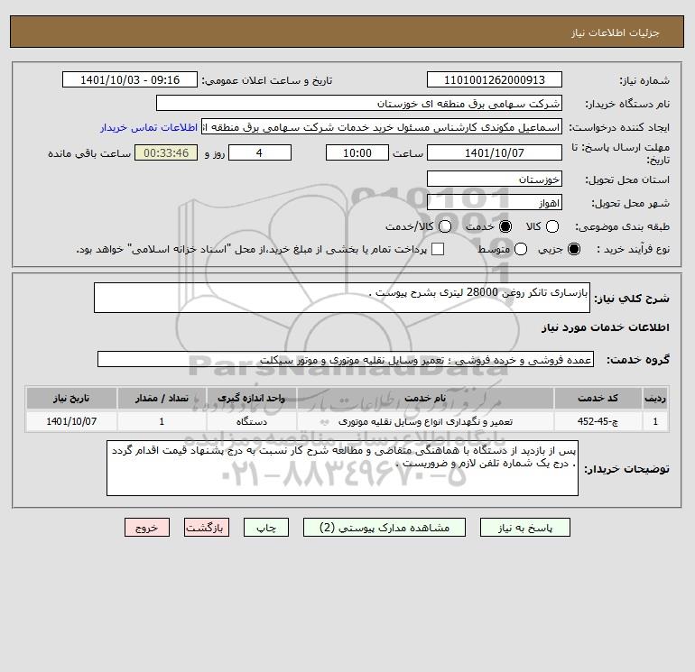 شرح کلی نیاز: بازساری تانکر روغن 28000 لیتری بشرح پیوست .