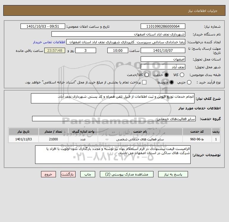 شرح کلی نیاز: انجام خدمات توزیع قبوض و ثبت اطلاعات از قبیل تلفن همراه و کد پستی شهرداری نجف آباد.