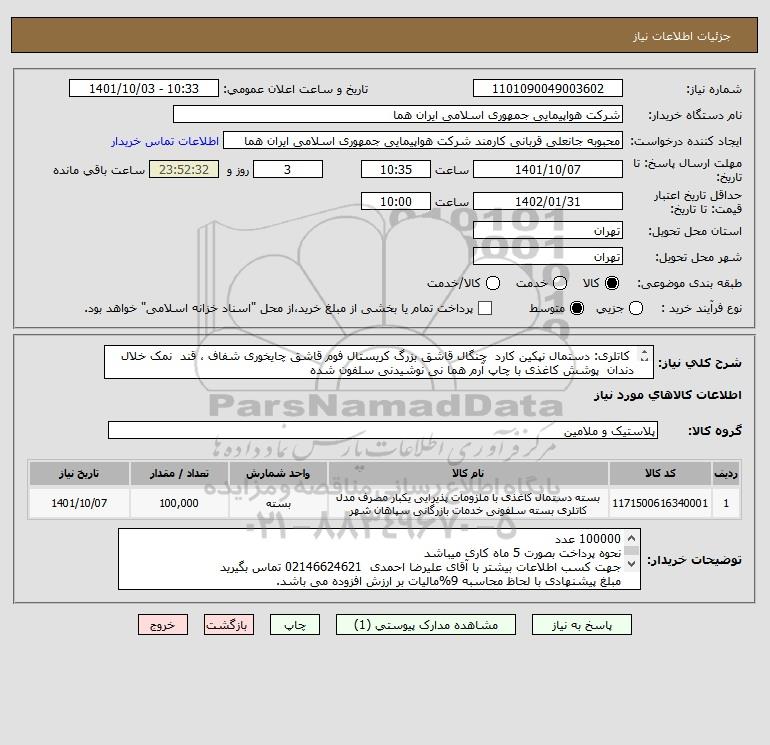 شرح کلی نیاز: کاتلری: دستمال نپکین کارد چنگال قاشق بزرگ کریستال فوم قاشق چایخوری شفاف ، قند نمک خلال دندان پوشش کاغذی با چاپ آرم هما نی نوشیدنی سلفون شده