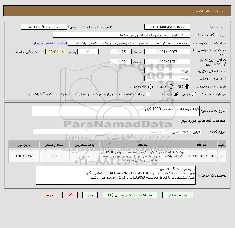 شرح کلی نیاز: فیله گوساله پاک شده 1000 کیلو