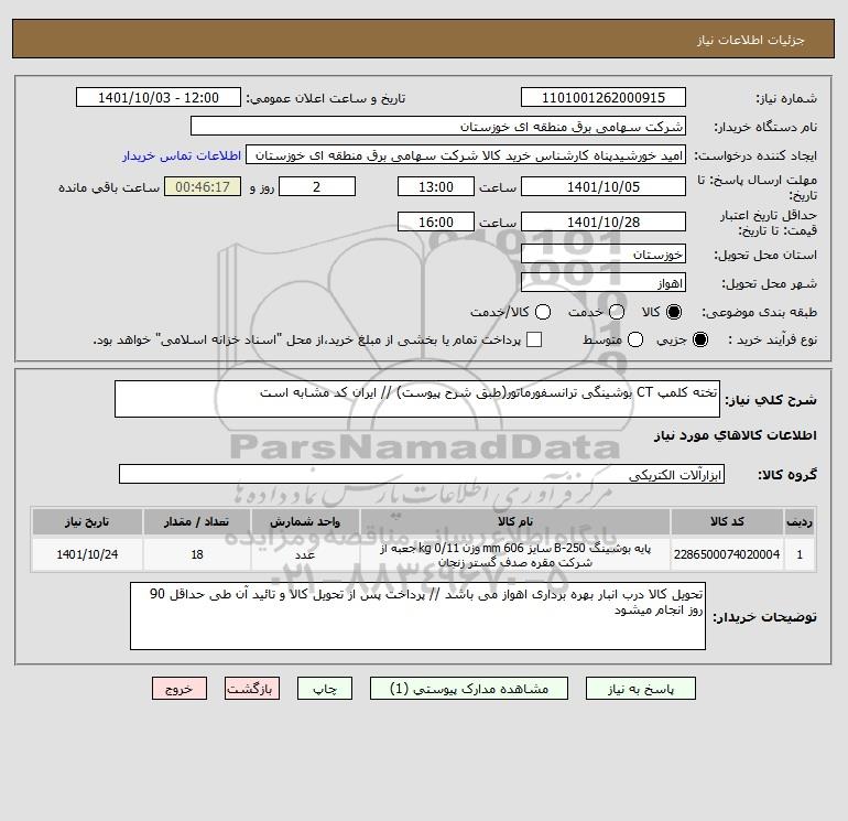 استعلام تخته کلمپ CT بوشینگی ترانسفورماتور(طبق شرح پیوست) // ایران کد مشابه است, استعلام تخته کلمپ CT بوشینگی ترانسفورماتور(طبق شرح پیوست) // ایران کد مشابه است