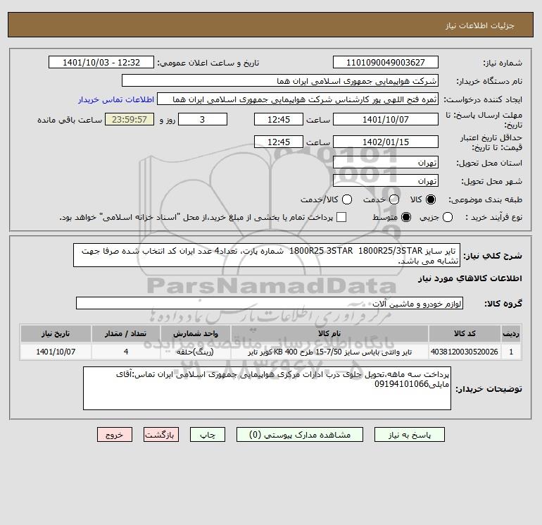 شرح کلی نیاز: تایر سایز 1800R25 3STAR 1800R25/3STAR شماره پارت، تعداد4 عدد ایران کد انتخاب شده صرفا جهت تشابه می باشد.