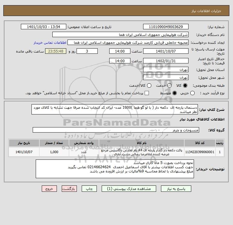 شرح کلی نیاز: دستمال پارچه ای دکمه دار ( با لو گو هما )1000 عدد- ایران کد انتخاب شده صرفا جهت تشابه با کالای مورد نظر میباشد