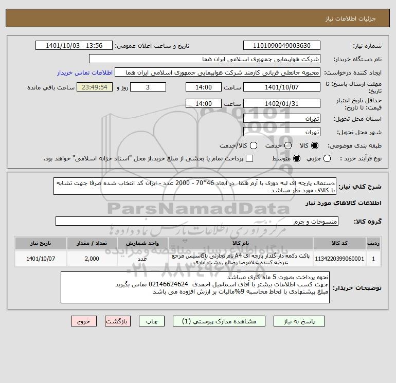 شرح کلی نیاز: دستمال پارچه ای لبه دوزی با آرم هما در ابعاد 46*70 - 2000 عدد - ایران کد انتخاب شده صرفا جهت تشابه با کالای مورد نظر میباشد