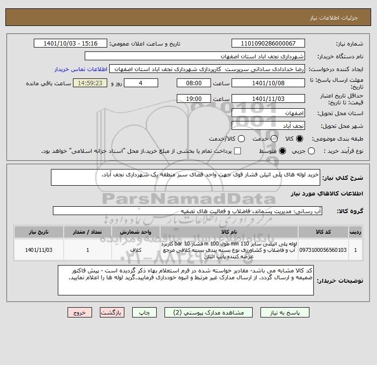 شرح کلی نیاز: خرید لوله های پلی اتیلن فشار قوی جهت واحد فضای سبز منطقه یک شهرداری نجف آباد.