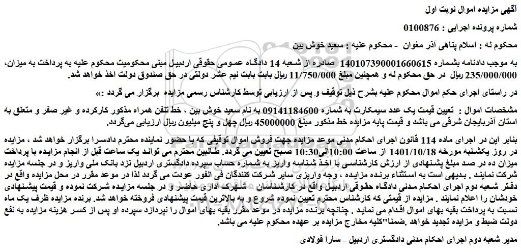 ،به موجب دادنامه بشماره 140107390001660615 صادره از شعبه 14 دادگاه عمومی حقوقی اردبیل مبنی محکومیت محکوم علیه به پرداخت به میزان 235/000/000 ریال در حق محکوم له و همچنین مبلغ 11/750/000 ریال بابت بابت نیم عشر دولتی در حق صندوق دولت اخذ خواهد شد.
