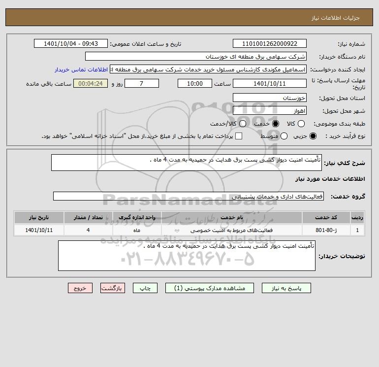 شرح کلی نیاز: تاًمینت امنیت دیوار کشی پست برق هدایت در حمیدیه به مدت 4 ماه .