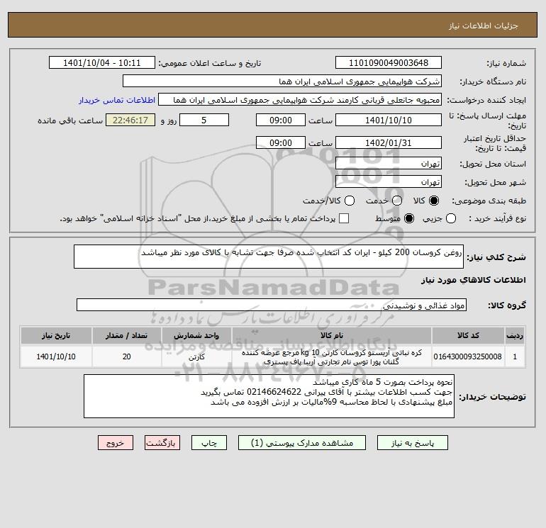 شرح کلی نیاز: روغن کروسان 200 کیلو - ایران کد انتخاب شده صرفا جهت تشابه با کالای مورد نظر میباشد