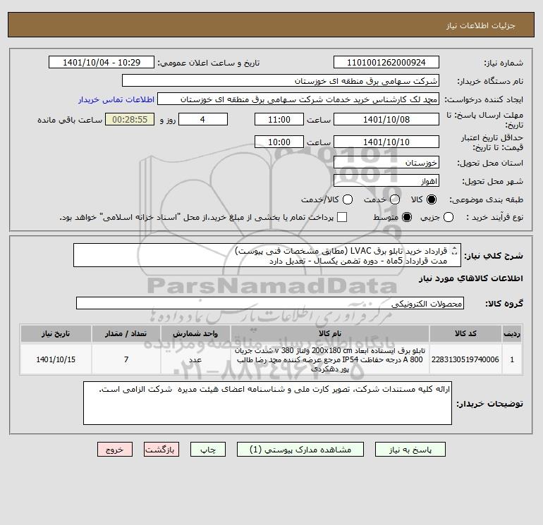 شرح کلی نیاز: قرارداد خرید تابلو برق LVAC (مطابق مشخصات فنی پیوست) مدت قرارداد 5ماه - دوره تضمن یکسال - تعدیل دارد