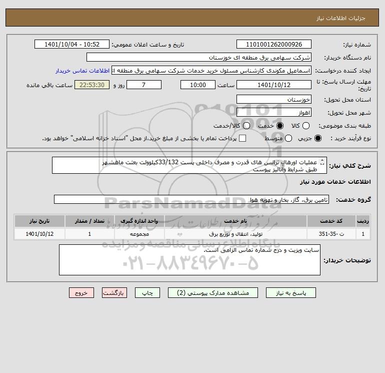 شرح کلی نیاز: عملیات اورهال ترانس های قدرت و مصرف داخلی پست 33/132کیلوولت بعثت ماهشهر