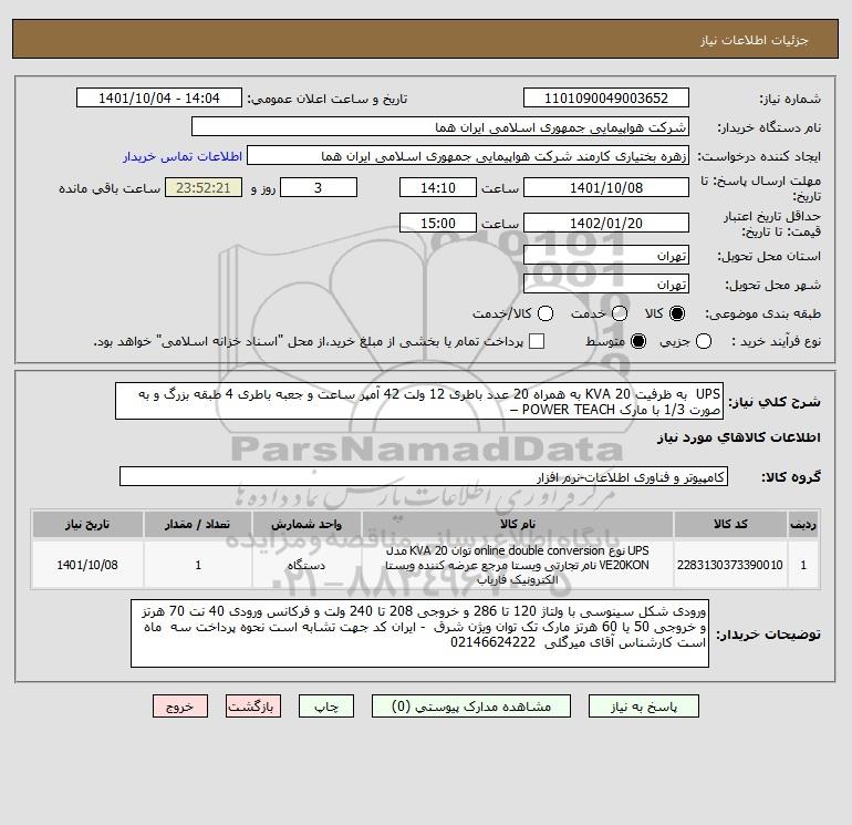 استعلام UPS به ظرفیت KVA 20 به همراه 20 عدد باطری 12 ولت 42 آمپر ساعت و جعبه باطری 4 طبقه بزرگ و به صورت 1/3 با مارک POWER TEACH –, استعلام UPS به ظرفیت KVA 20 به همراه 20 عدد باطری 12 ولت 42 آمپر ساعت و جعبه باطری 4 طبقه بزرگ و به صورت 1/3 با مارک POWER TEACH –