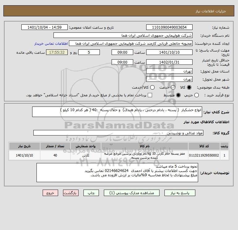 شرح کلی نیاز: انواع خشکبار ( پسته ، بادام درختی ، بادام هندی) و خلال پسته -40 ( هر کدام 10 کیلو )
