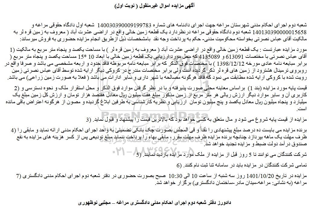 شعبه دوم اجرای احکام مدنی شهرستان مراغه جهت اجرای دادنامه های شماره 140030390009199783 شعبه اول دادگاه حقوقی مراغه و 140130390000015658 شعبه دوم دادگاه حقوقی مراغه درنظردارد یک قطعه زمین خالی واقع در اراضی عشرت آباد ( معروف به زمین قره لر به مالکیت آقای عباس نصرتی بخواسته محکومیت مدنی- حکم به پرداخت وجه نقد بامشخصات ذیل ازطریق انجام مزایده حضوری به فروش میرساند: