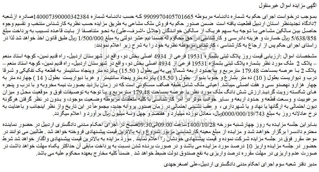 بموجب درخواست اجرای حکم به شماره دادنامه مربوطه 9909970405701665 که حسب دادنامه شماره 140007390000342384صادره ازشعبه 7دادگاه تجدیدنظر استان اردبیل قطعیت یافته است ضمن صدور حکم به فروش ملک مشاعی به طریق مزایده حسب نظریه کارشناس منتخب و تقسیم وجوه حاصل بین مالکین مشاعی با توجه به سهم هریک از مالکین خواندگان (جلال -اشرف-علی) به نحو متناصفا از بایت قاعده تسبیب به پرداخت مبلغ 5/638/858 ریال خسارت و هزینه دادرسی و کارشناسی در حق محکوم له ضمنا نیم عشر دولتی به مبلغ 1/500/000 ریال طبق قانون اخذ خواهد شد لذا در راستای اجرای حکم پس از ارجاع به کارشناسی ، کارشناس مربوطه نظریه خود را به شرح زیر اعلام نمودند: