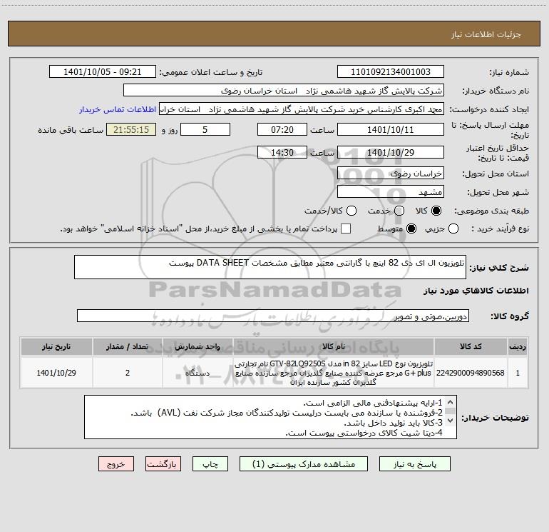 نام دستگاه خریدار:شرکت پالایش گاز شهید هاشمی نژاد استان خراسان رضوی