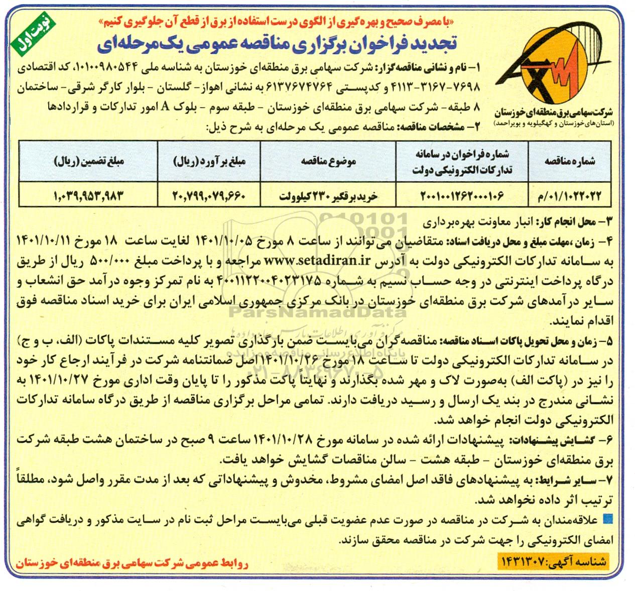 | 1022022/ 01 / م | 2001001262000106 | خرید برقگیر 230 کیلوولت | 20.799.079.660 | 1.039.953.983 |