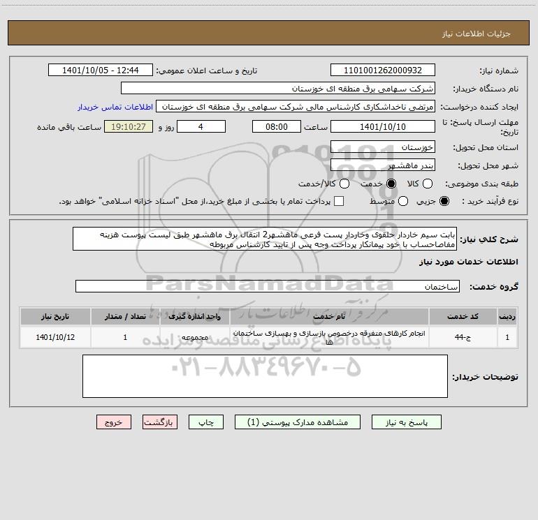 شرح کلی نیاز: بابت سیم خاردار حلقوی وخاردار پست فرعی ماهشهر2 انتقال برق ماهشهر طبق لیست پیوست هزینه مفاصاحساب با خود پیمانکار پرداخت وجه پس از تایید کارشناس مربوطه